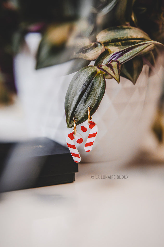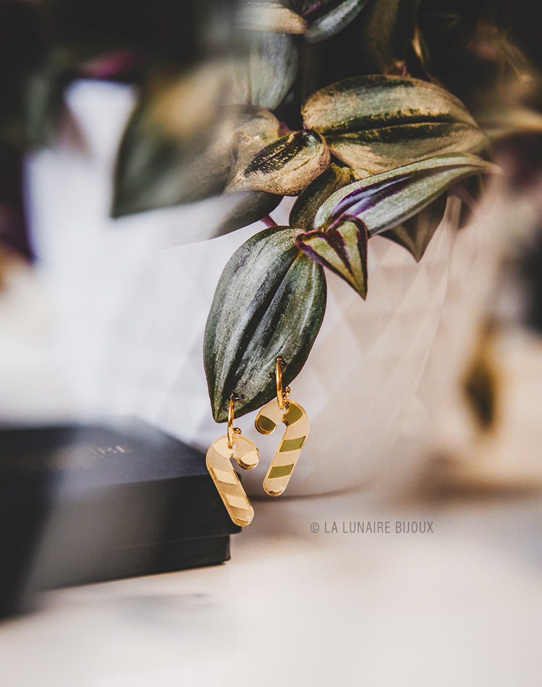 Je suis en forme de sucre d'orge tout mignon pour illuminer vos oreilles lors des fêtes. Mes créoles de 12 mm sont en acier inoxydable avec un placage doré (Or 18K). Elles sont composées de plexi miroir disponibles dans plusieurs couleurs et d'une version en rouge et blanc.